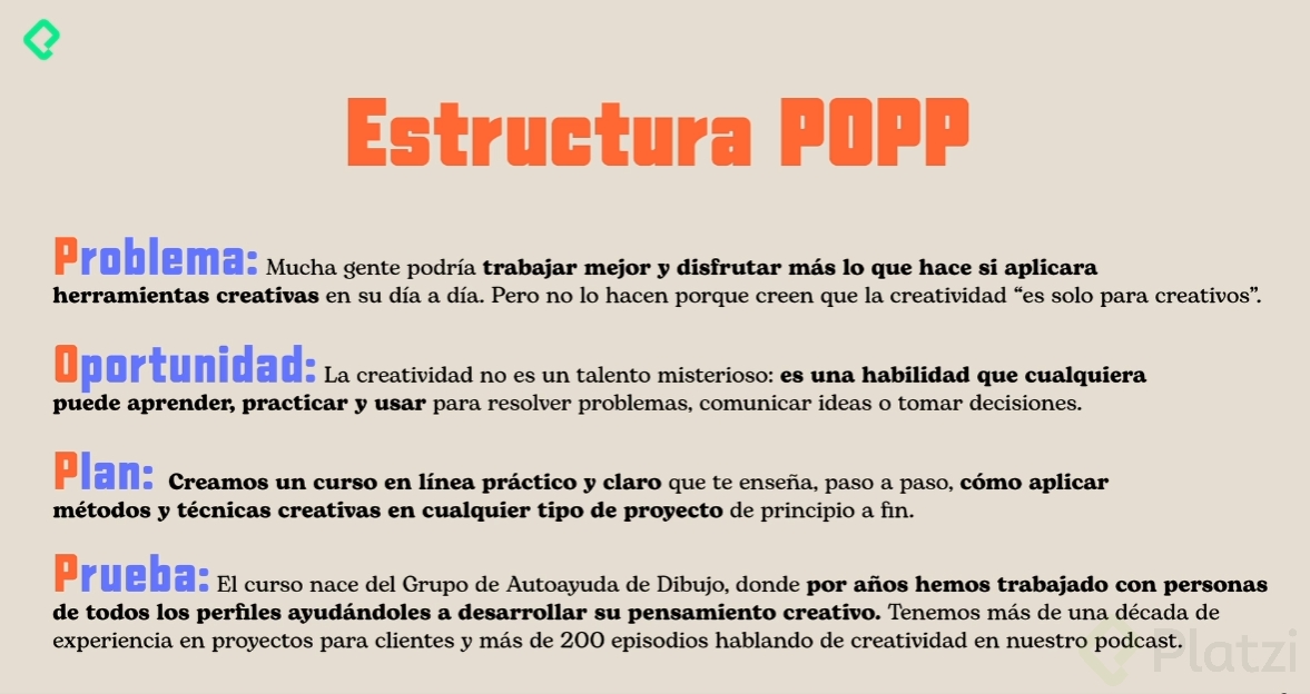 - Plan: cuenta cómo lo resolverás con pasos claros. Un curso en línea práctico y claro que enseña métodos y técnicas creativas aplicables a cualquier proyecto.