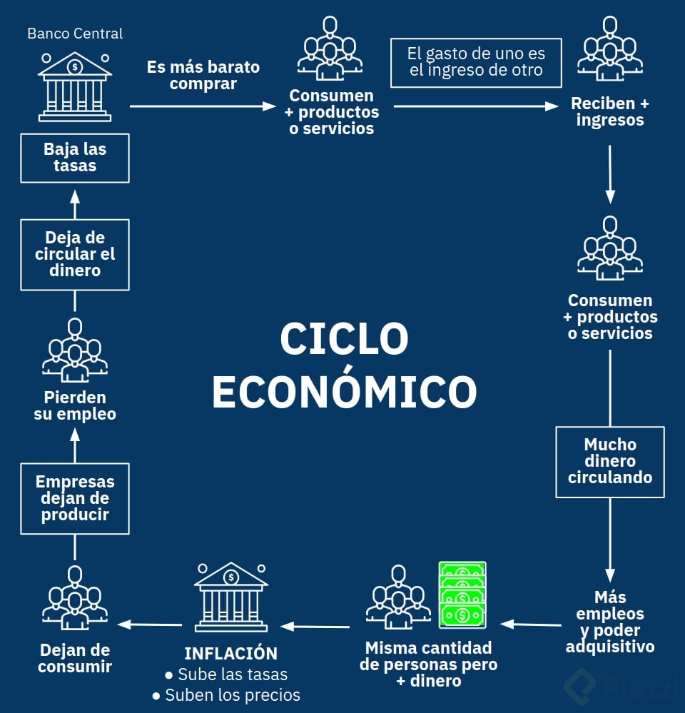 Los ciclos económicos son una serie de fases que la economía atraviesa regularmente, y entenderlos es vital para manejar nuestras finanzas de manera más efectiva. Todo ciclo económico inicia con el Banco Central bajando las tasas de interés, lo que abarata los créditos y facilita el consumo de bienes y servicios.