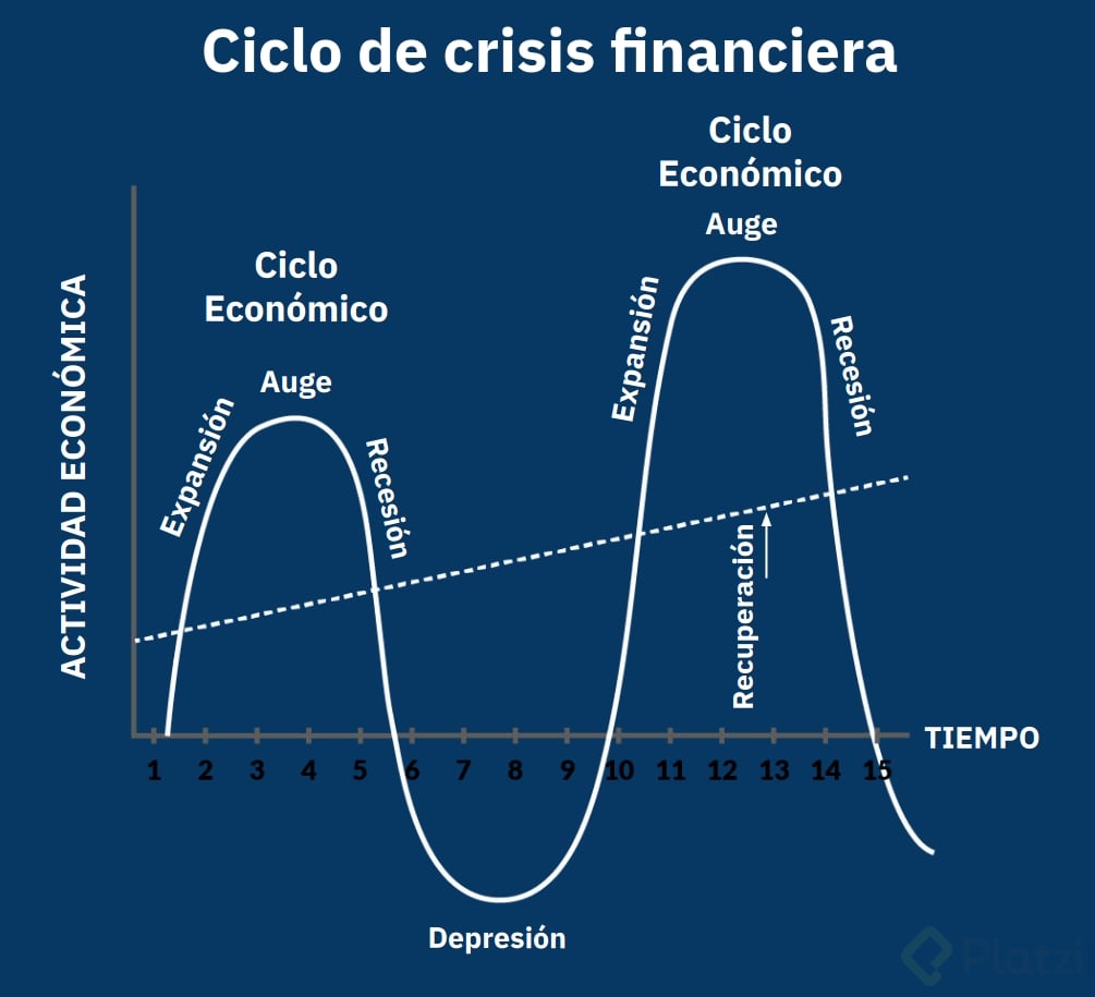 Depresión: Una etapa más severa que la recesión, caracterizada por una caída pronunciada en la economía y una recuperación incierta. Finalmente, se pasa a la recuperación, donde la economía inicia un proceso de estabilidad, y el ciclo comienza de nuevo.
