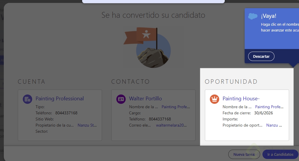 - Confirmar la Conversión: Una vez convertido, Salesforce confirmará la creación del contacto, cuenta y oportunidad.