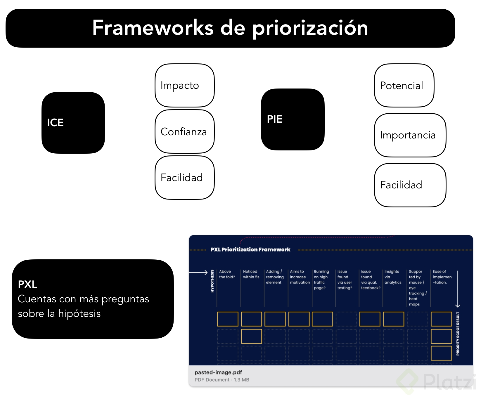 El framework PXL es una herramienta de priorización ampliamente utilizada en el ámbito de la experimentación digital y el Product Management. Diseñada por Spiritus y Excel, busca superar las limitaciones de otros métodos populares como ICE y PIE al abordar aspectos específicos esenciales para la toma de decisiones, tales como el volumen de tráfico disponible y la ubicación del tratamiento. Al realizar una evaluación más comprensiva, ayuda a enfocar los esfuerzos en experimentos con mayores probabilidades de generar resultados relevantes y significativos para el negocio.