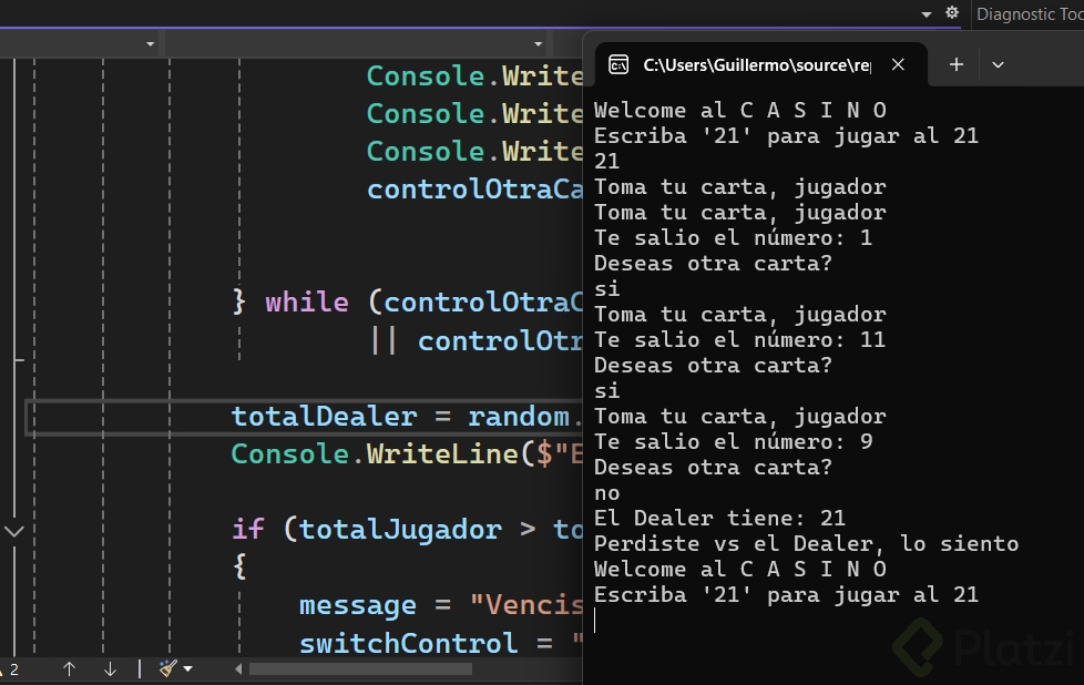 El siguiente paso fue añadir un nivel de dificultad al juego. Aquí, utilizamos generadores de números aleatorios para asignar valores al 'dealer', mimetizando la experiencia real de un casino.