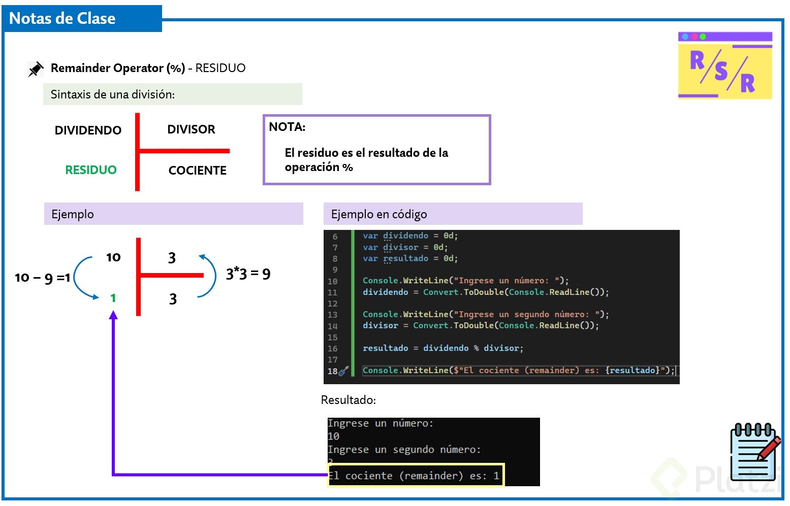 %): Para obtener el resto de una división.