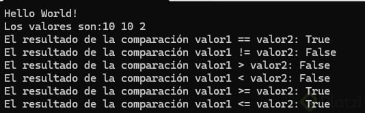 bool resultado1 = valor1 == valor2;// Retorna falso porque 10 no es igual a 1Console.WriteLine("El resultado de valor1 == valor2 es: "+ resultado1);