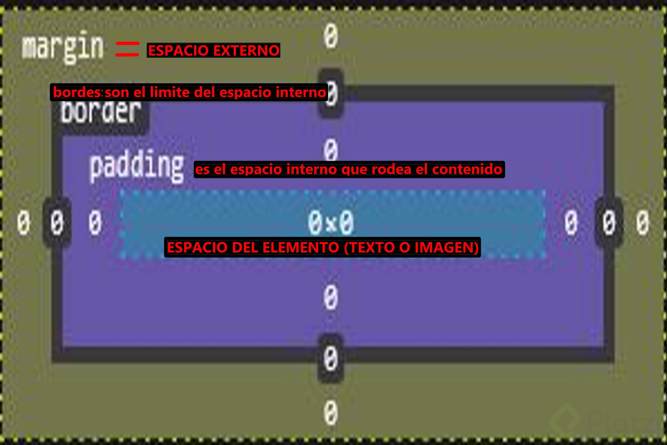 - Padding: espacio interno entre contenedor y contenido. Al quitarlo, el contenido se pega al borde.