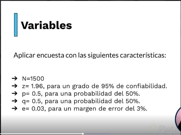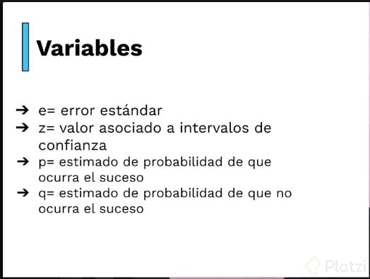 - Error estándar (e): Variación aceptable en los resultados (en este caso, 3%).