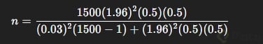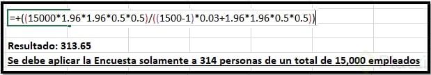 Supongamos que 1500 personas, probabilidad (p y q) al 50%, Z del 95% (1.96), el error estándar del 3%, el cálculo sería: