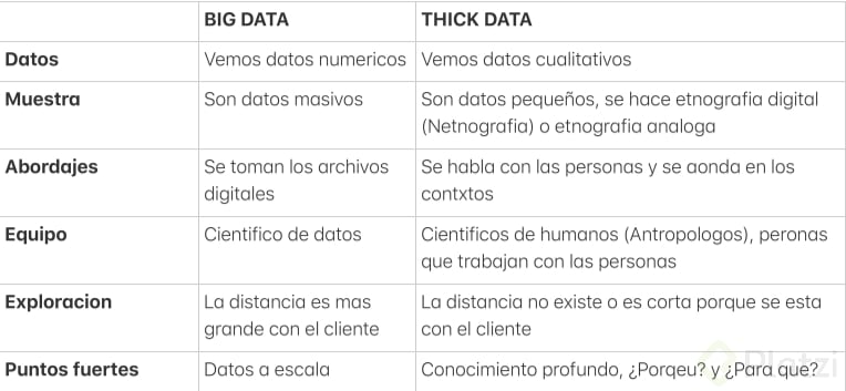 A diferencia de Big-Data, donde las investigaciones son cuantitativas, Thick-Data (datos gruesos) es cualitativo, se centra en las narrativas, y permite obtener datos que responden al porqué y al para qué de un negocio.