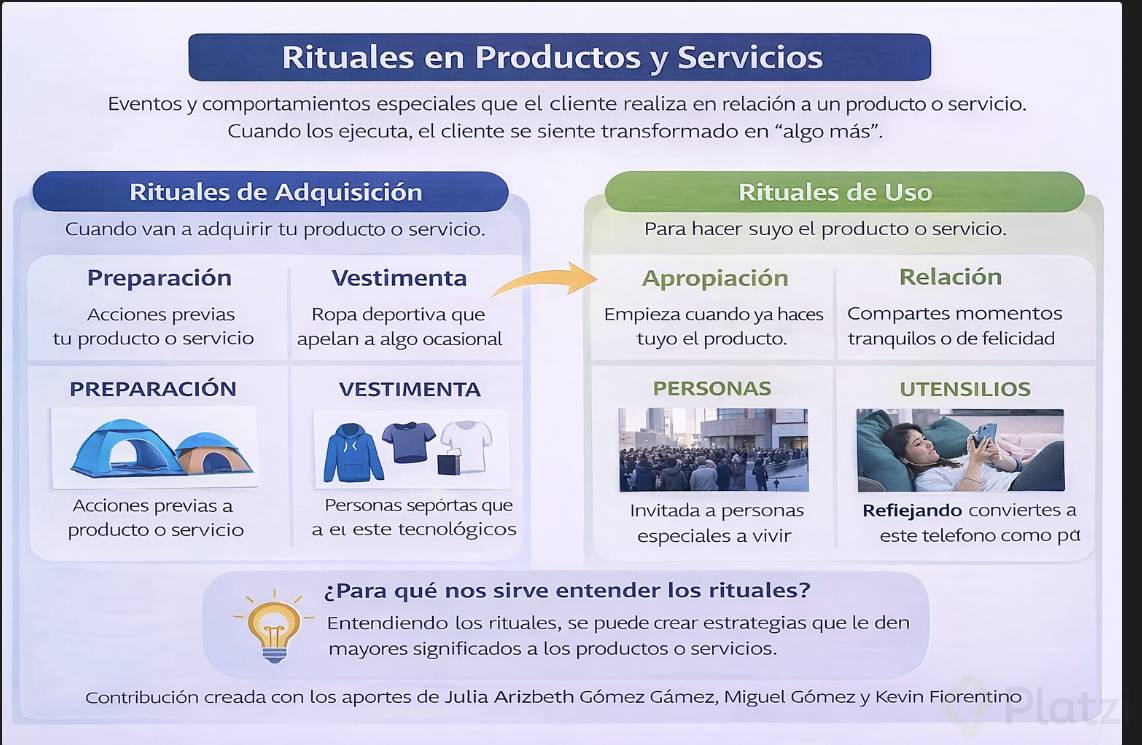 Los rituales son los eventos y comportamientos especiales que el cliente realiza con relación al producto o servicio. Cuando los ejecuta, el cliente siente y percibe que se transforma en “algo más”. Y estos en se dividen en: