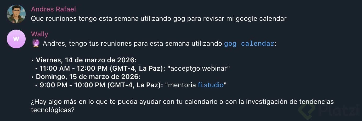 Prueba con tu agente en Telegram. Pregunta: ¿Qué reuniones tengo hoy? Si no usa GOG, indícale: utiliza GOG para revisar mi Google Calendar. Verás el resumen de tu día e incluso análisis útil, por ejemplo: tienes más de ocho horas de juntas hoy.