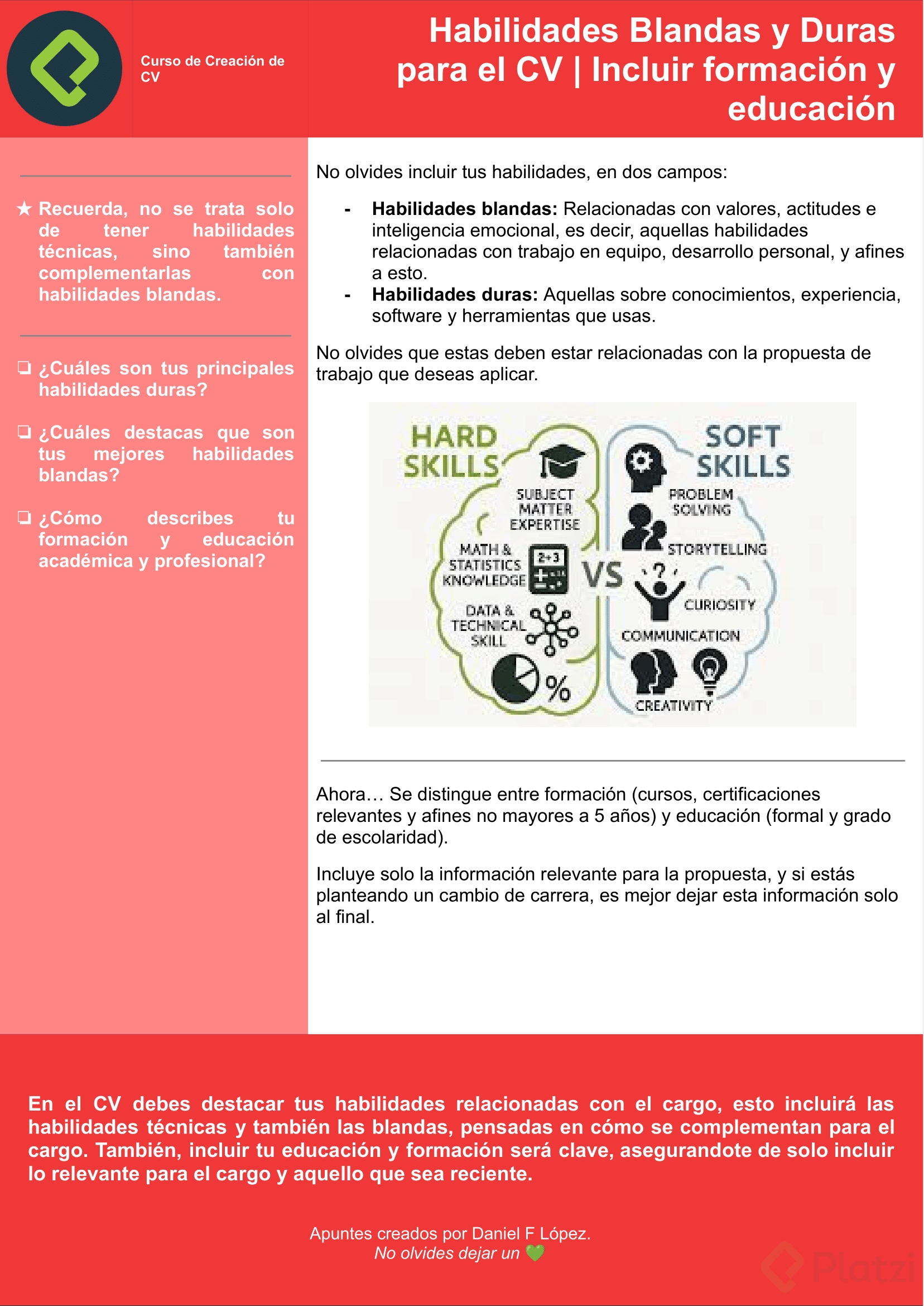 El currículum tiene que hablar por ti y resaltar tus capacidades de manera efectiva. Comparte evidencia de cómo has aplicado lo aprendido, ya sea a través de ejemplos concretos de proyectos anteriores o resultados obtenidos. Si bien la educación formal es crucial, la formación especializada con frecuencia otorga las herramientas necesarias para destacar en un ambiente profesional cambiante.