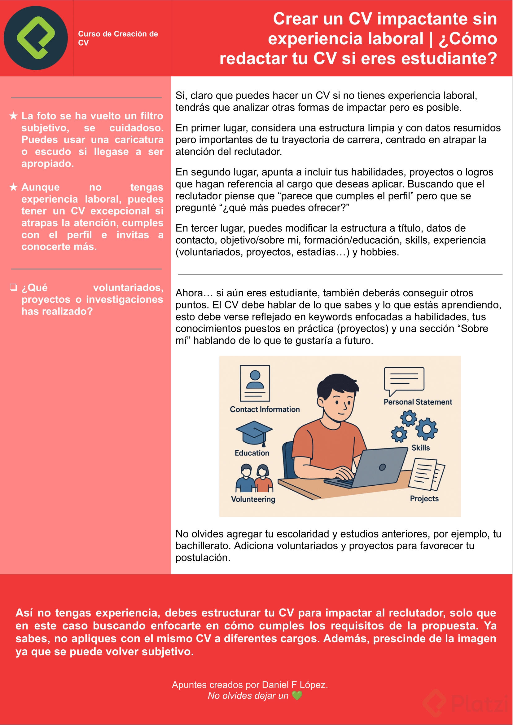 Al estar en una etapa de estudiante, tener un currículum bien preparado es esencial para diferentes oportunidades como becas, pasantías o prácticas profesionales. Este documento debe reflejar no solo lo que ya sabes sino también lo que estás aprendiendo. Destacar tus habilidades, conocimientos prácticas y experiencias colaborativas es clave. Aunque aún estés en formación, estas experiencias son altamente valoradas por quienes evalúan tus solicitudes.