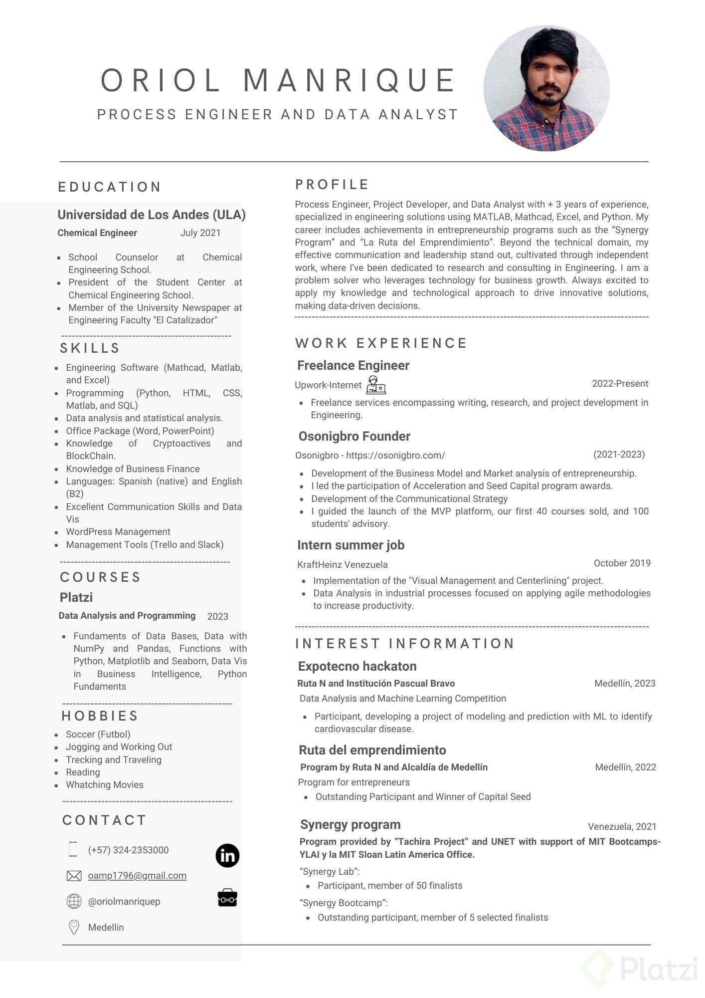 - Sección Sobre Mí: Incluye una breve historia explicando por qué has decidido cambiar de carrera, destacando las capacidades y conocimientos actuales que te preparan para el nuevo rol.