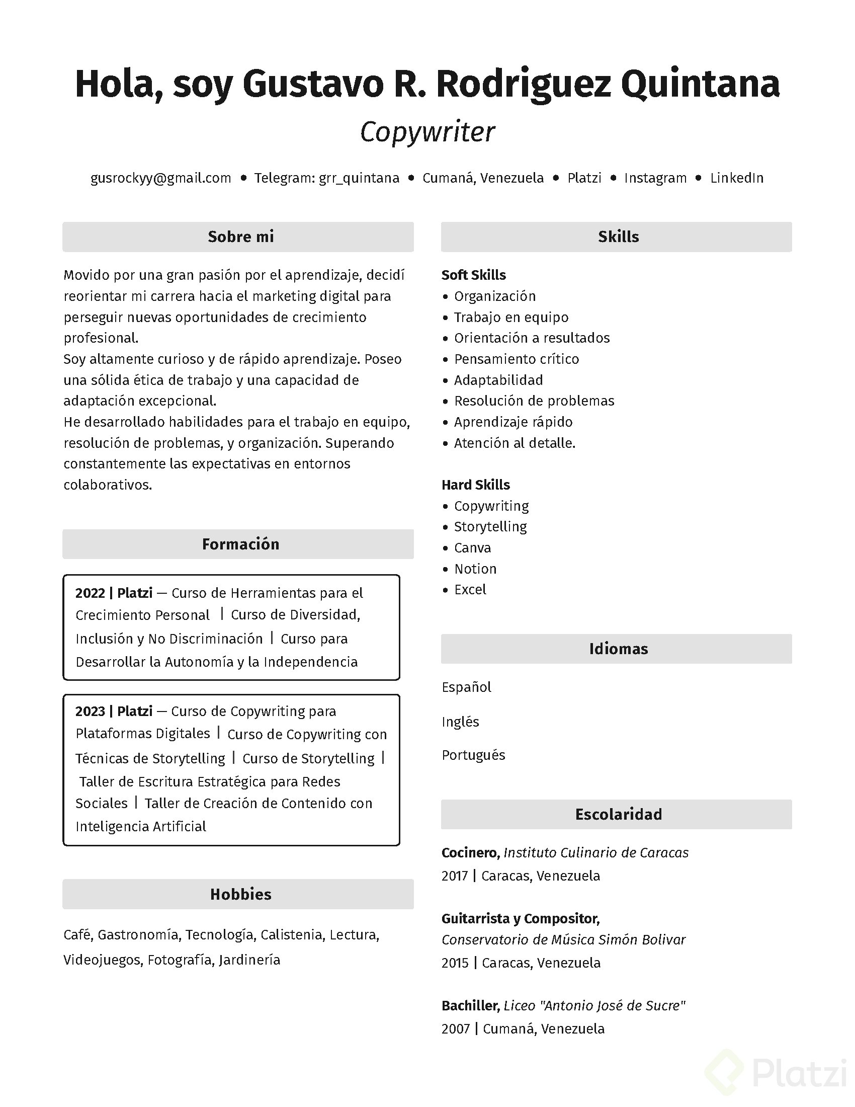- Experiencia: Incluye proyectos propios que demuestren la aplicación de tus nuevas habilidades. Esto puede reemplazar experiencia laboral previa no relacionada.
