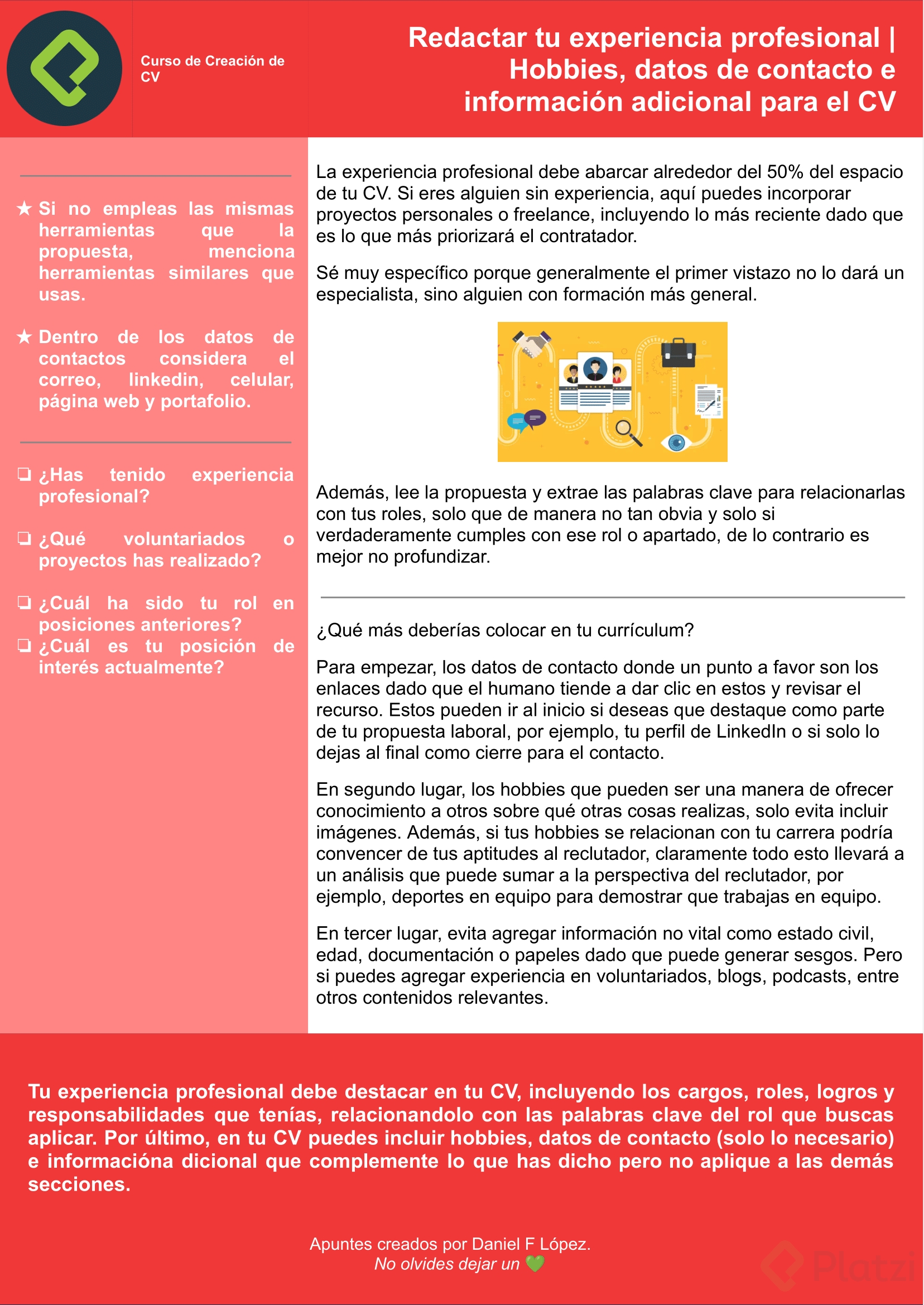 - Enlace a LinkedIn: Es imprescindible, ya que actúa como un complemento del CV. Si aún no tienes tu perfil optimizado, en Platzi ofrecemos una guía.