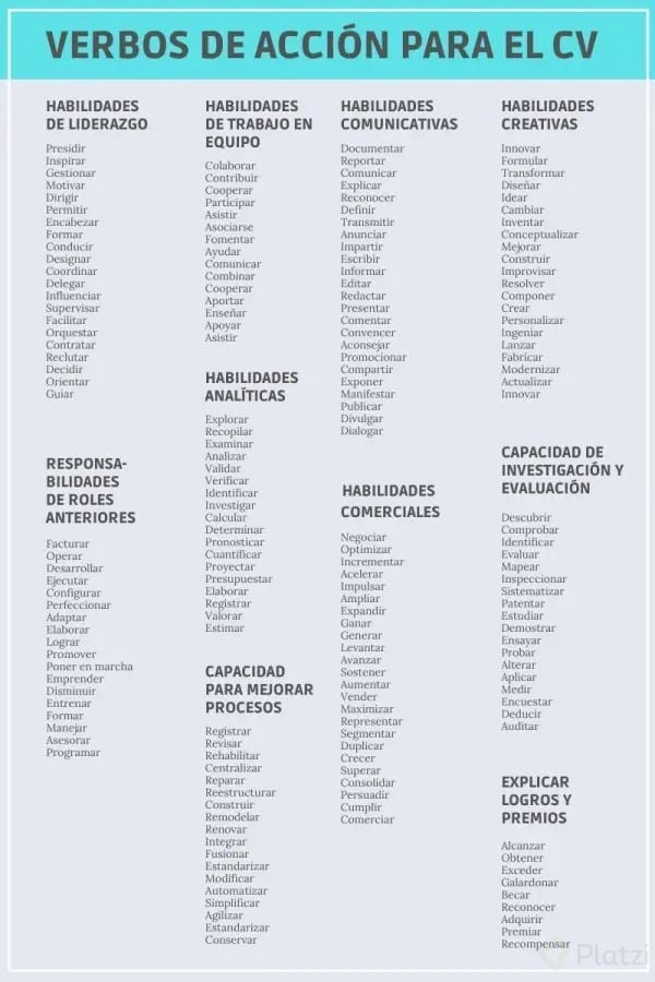 Verbos activos: Requieren un sujeto y son perfectos para detallar actividades específicas que realizabas en tu empleo anterior o actual. Usualmente se utilizan para describir acciones concretas: "Coordiné, implementé y ejecuté 8 campañas logrando entre un 80 y 90% de los objetivos".
