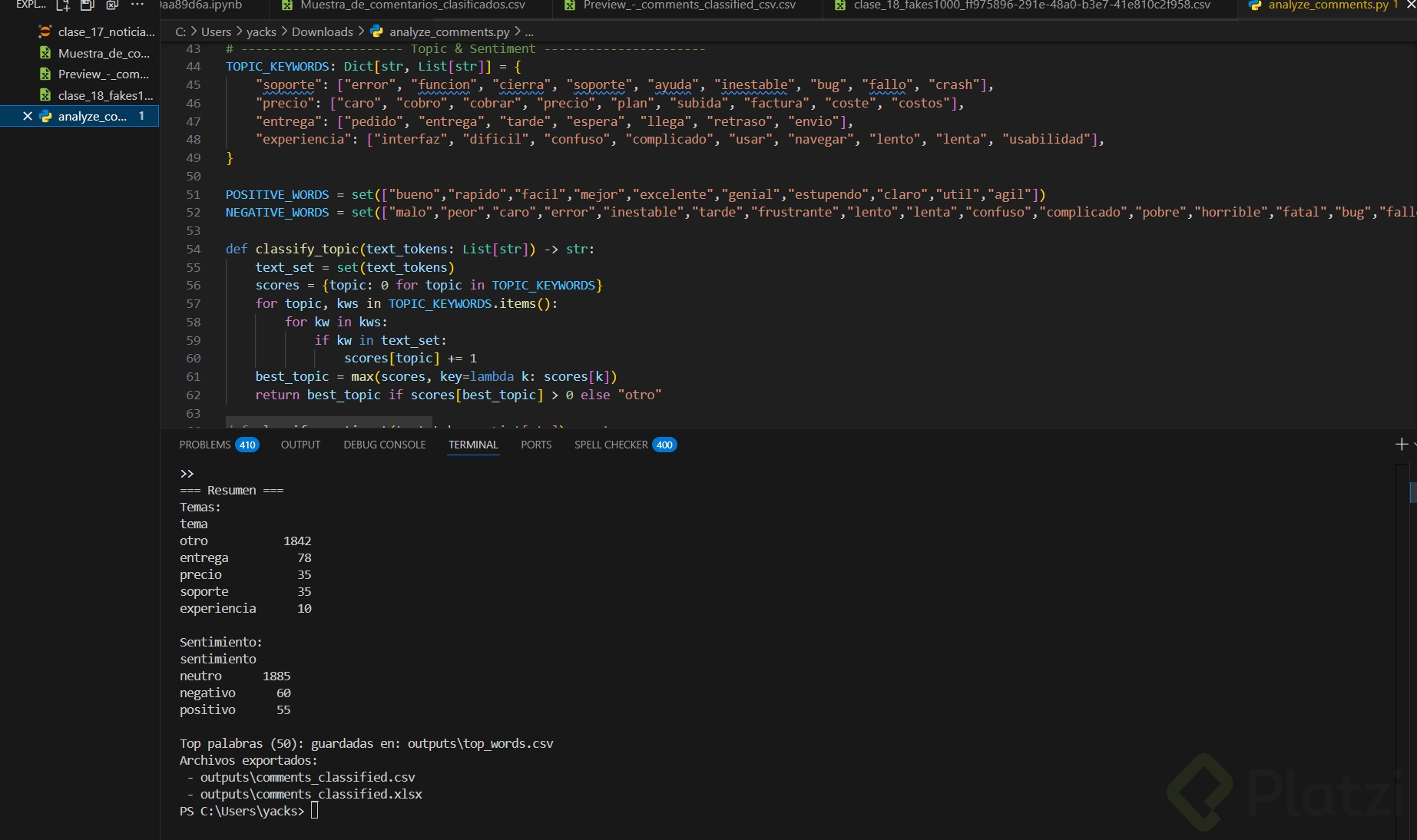 - Responde: ¿qué tema se repite más? ¿qué emoción predomina? ¿qué insight no verías solo con métricas numéricas?
