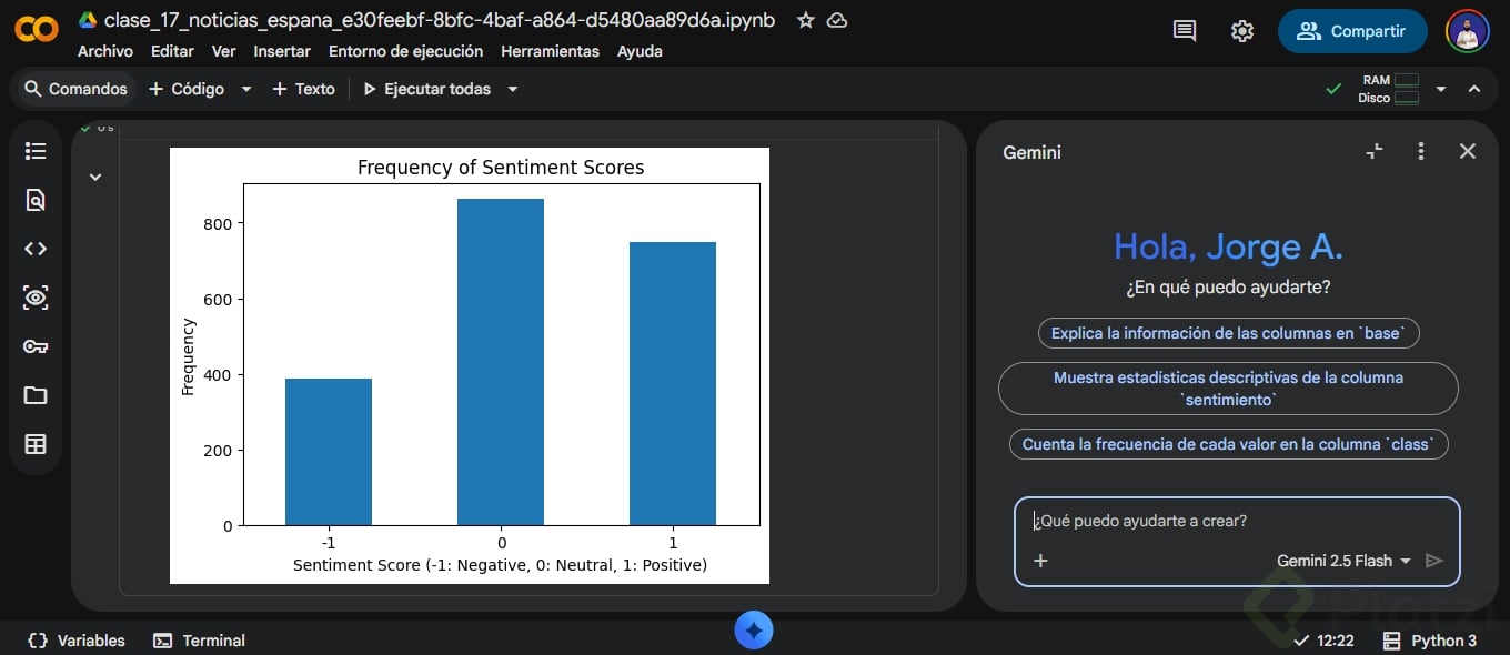 Habilidades que ejercitas: limpieza y normalización de texto, eliminación de stop words, tokenización, extracción de frequent words, detección de tópicos, clasificación con compound y umbrales, y visualización con matplotlib. El objetivo es pensar con datos duros más contexto humano para tomar mejores decisiones, con y sin tecnología.