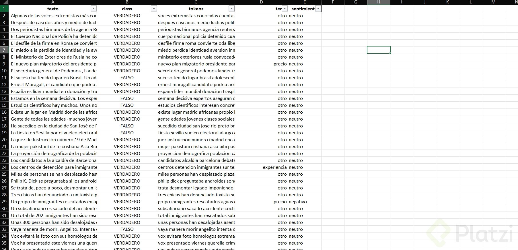 Se trabajó con un CSV llamado “Fakes Mile” con 2,000 comentarios y dos columnas: clase y texto (noticias de España). La secuencia incluyó lectura del archivo, limpieza de signos y patrones (abreviaciones, porcentajes, cifras), uso de un tokenizador, conversión a minúsculas, un flatten para unificar en una lista, y eliminación de puntuación y stop words en español.