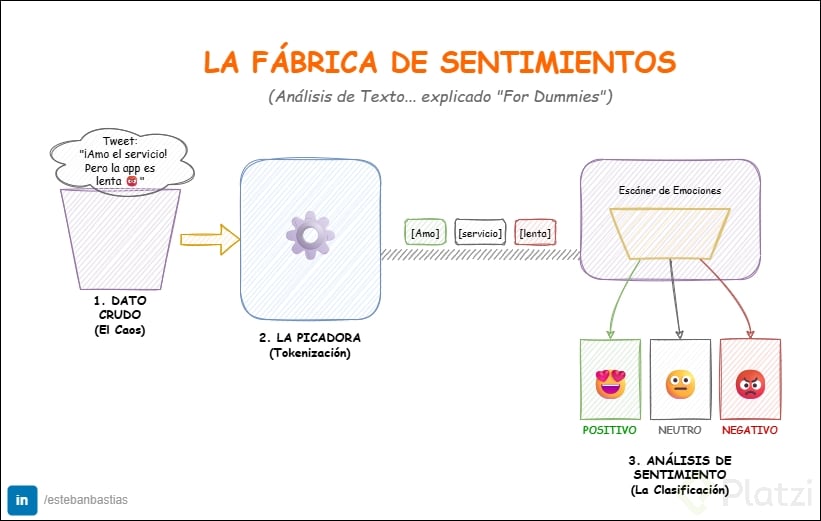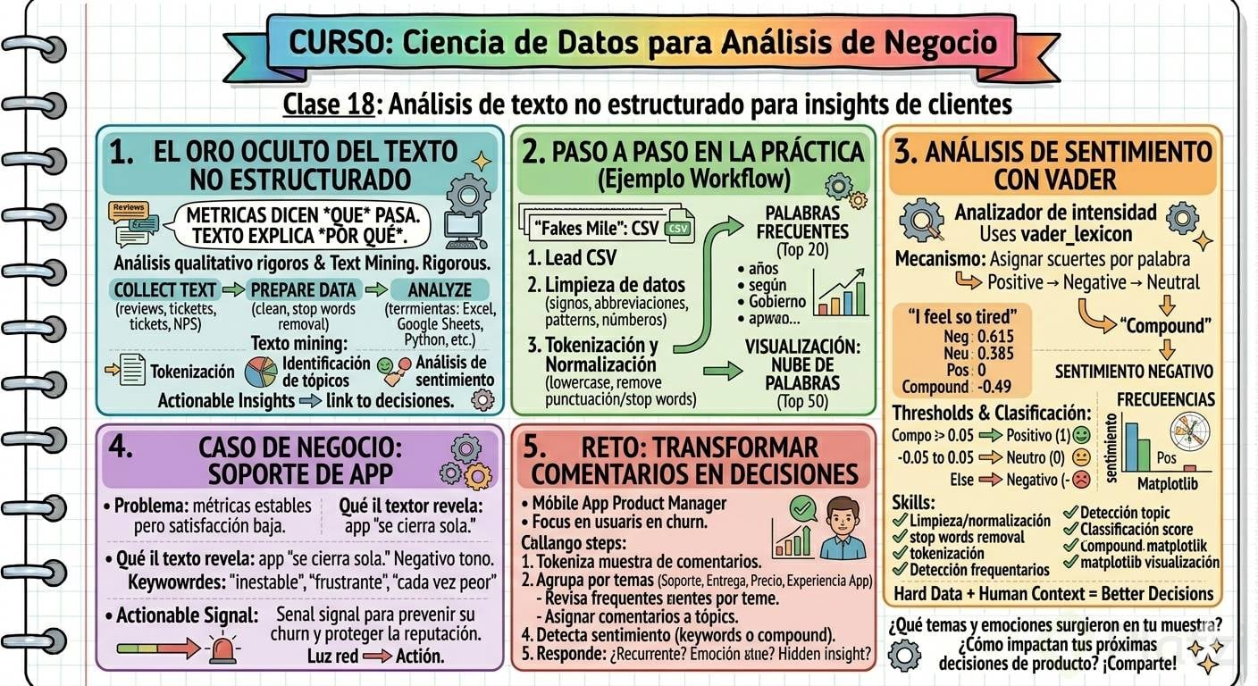 Caso de negocio típico: en soporte, cientos de tickets con métricas estables, pero baja satisfacción. La minería de texto revela patrones: la app “se cierra sola”, tono más negativo y keywords como “inestable”, “frustrante”, “cada vez peor”. Señal temprana para evitar churn y proteger reputación.