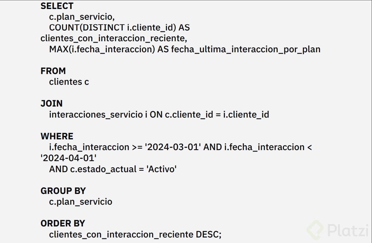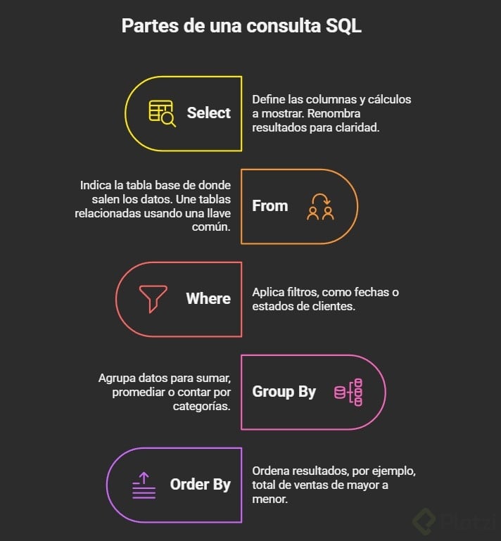 Una consulta típica se entiende leyendo de arriba hacia abajo. Cada parte responde a una pregunta de negocio específica. No necesitas escribirla, solo interpretar qué hace.