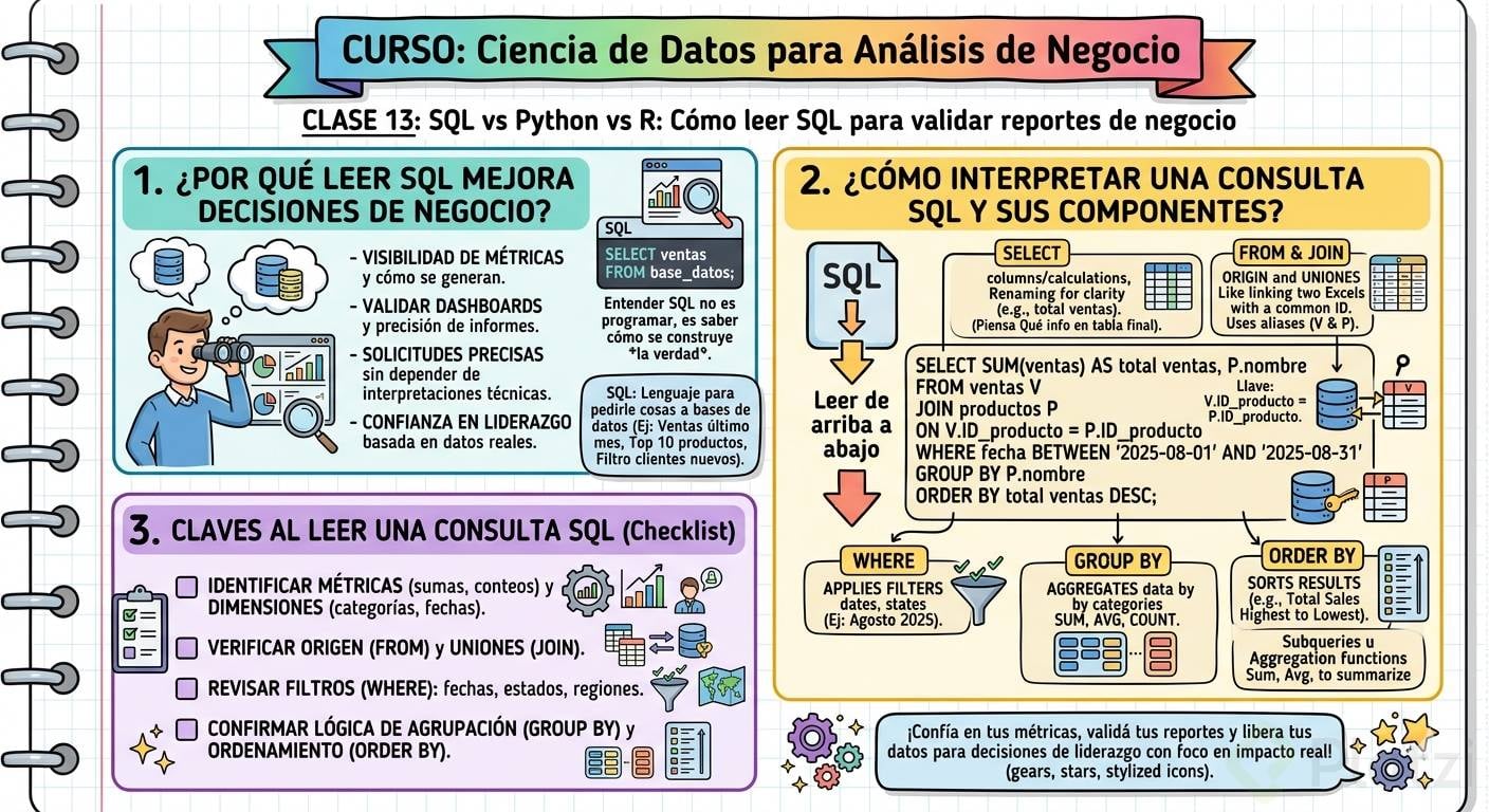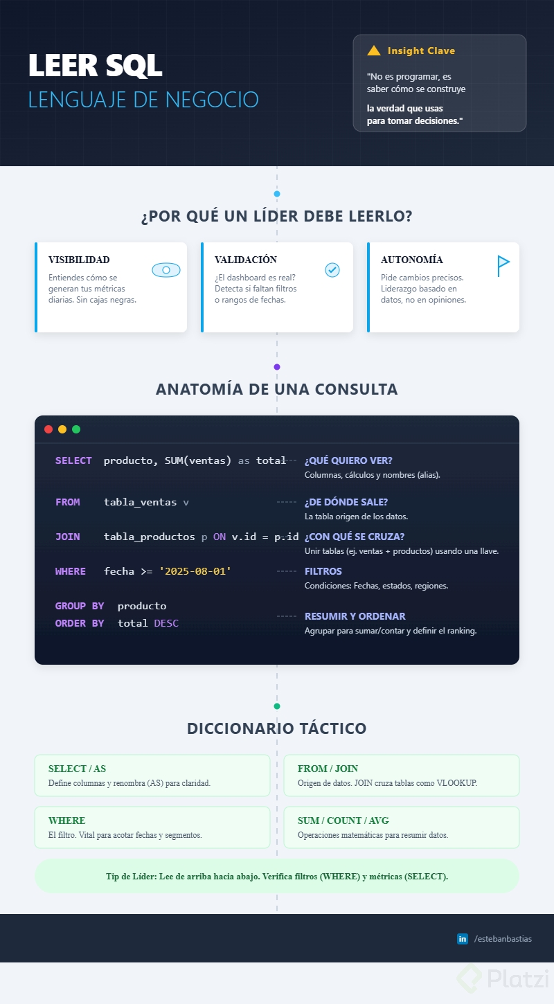Si tomas decisiones con datos, leer SQL te da control y claridad. Con entender una consulta, puedes validar un dashboard, pedir ajustes precisos y confiar en que la métrica refleja la realidad del negocio. Aquí aprenderás a interpretar SQL como lenguaje de negocio: simple, directo y útil para liderazgo.