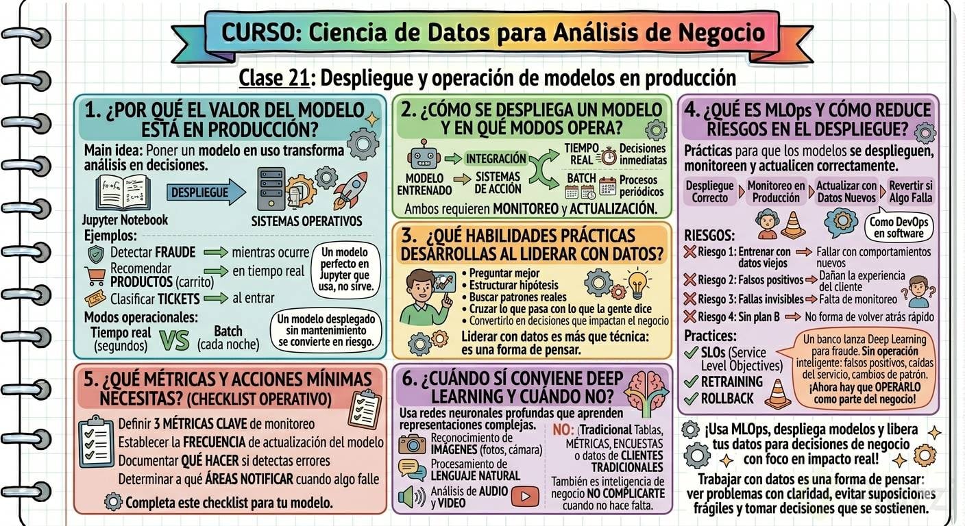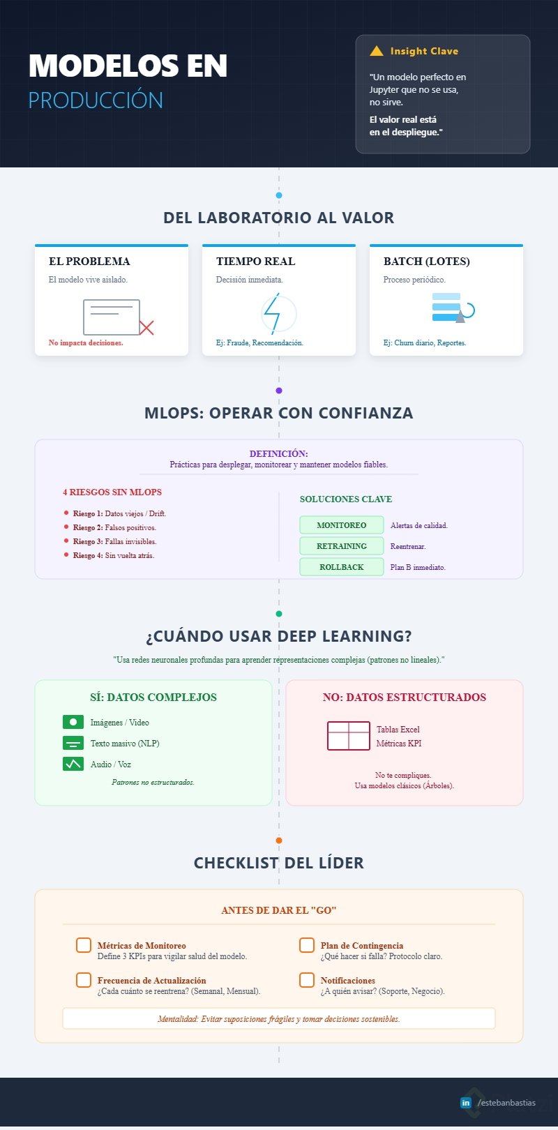 Llevar modelos a producción es donde ocurre el verdadero impacto. Aquí entenderás, con ejemplos claros, por qué un modelo excelente en laboratorio no basta, cómo operarlo con confianza, qué implica MLOps y cuándo sí conviene apostar por deep learning para generar valor real.