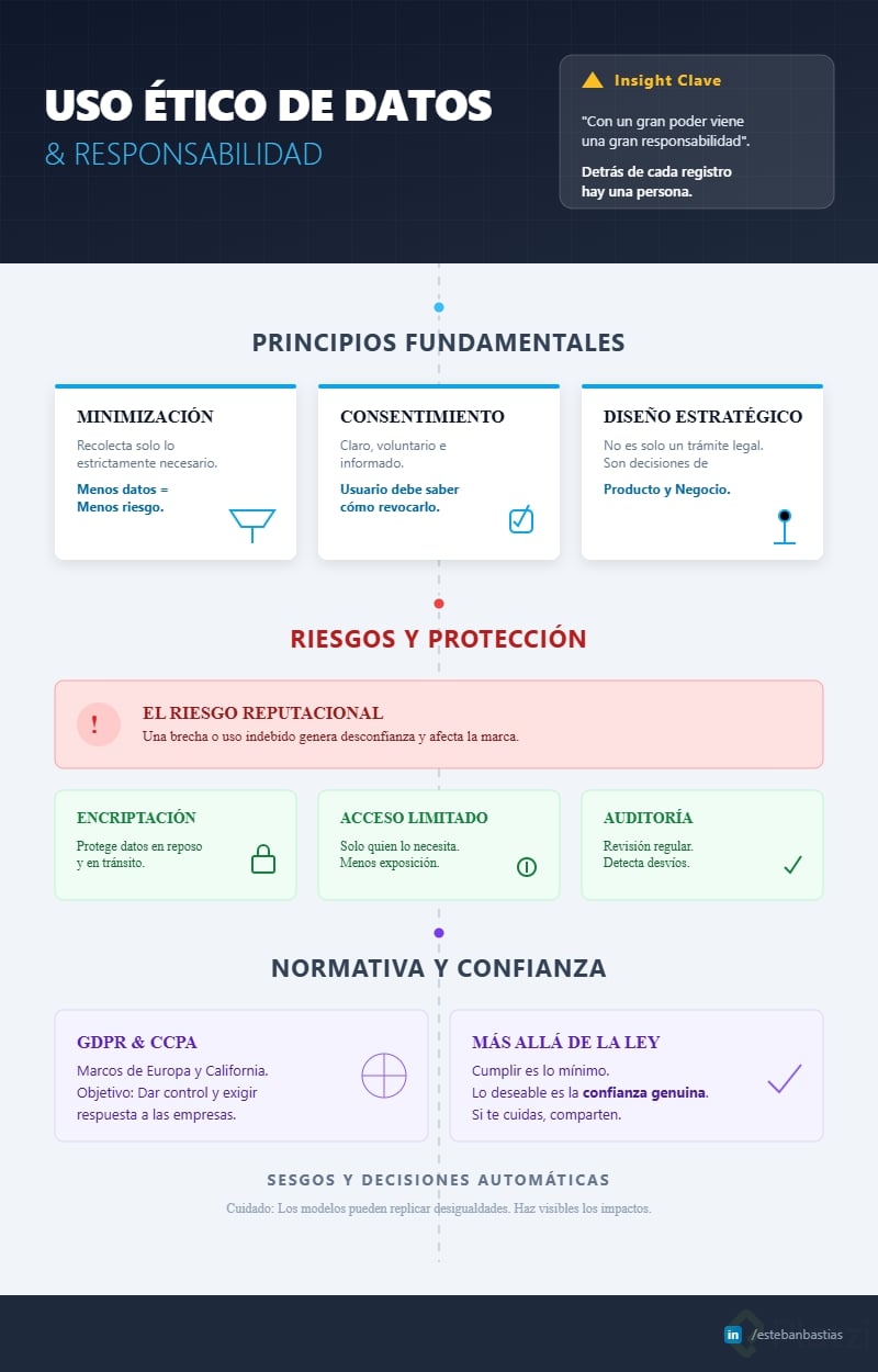 La idea central es simple y poderosa: con un gran poder viene una gran responsabilidad. Detrás de cada registro y de cada clic hay una persona. Tratar sus datos con cuidado es un imperativo ético y una decisión estratégica de producto, marketing y negocio.