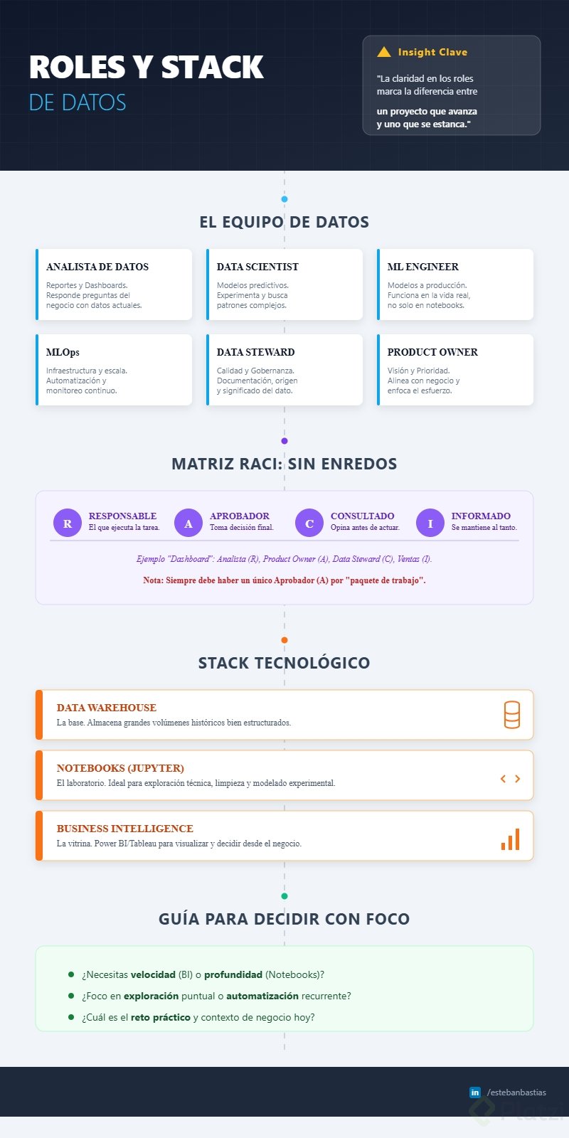 La claridad en roles, responsabilidades y stack de datos marca la diferencia entre un proyecto que avanza y uno que se estanca. Aquí se ordenan los perfiles clave, la matriz RACI y las herramientas esenciales para que lideres, planifiques o te integres con confianza y foco en impacto real.