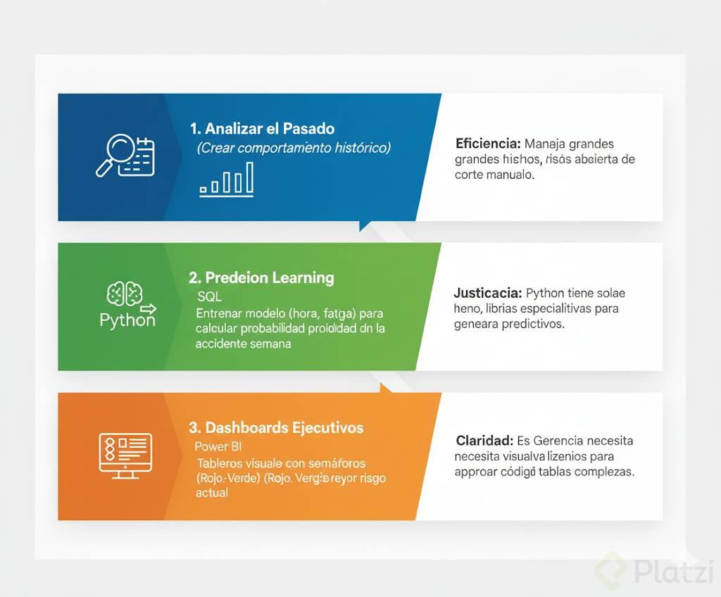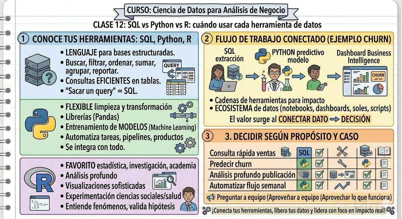 Imagina un proyecto de churn (clientes que se van). Las herramientas trabajan en cadena para lograr impacto de negocio. Ninguna funciona sola: lo importante es saber cuál usar, cuándo y por qué.