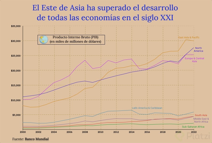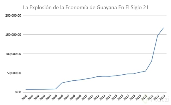 En el año 2000, la economía de Guyana valía 712 millones de dólares. Se mantuvo más o menos al mismo nivel hasta el 2006, cuando su PIB escaló a 2.300 millones de dólares. En el 2021, un crecimiento mucho más significativo sucedió, seguido por uno aún más grande en el 2022, hasta llegar a los 14.700 millones de dólares.