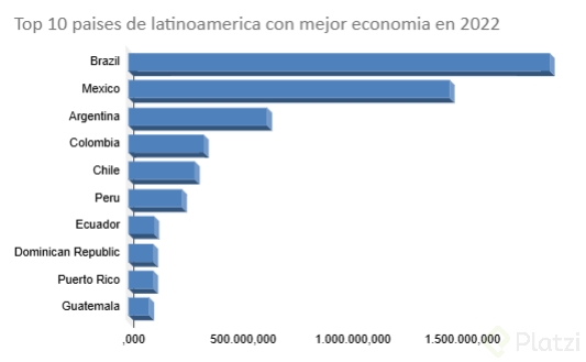 Así de rápido aparece una gráfica de barras unidimensional. Para mejorar la legibilidad, se recomienda cambiar la orientación a horizontal, ya que los nombres de los países se leen con mayor claridad. También conviene agregar un título descriptivo como «Las diez economías más grandes del mundo» [1:50].