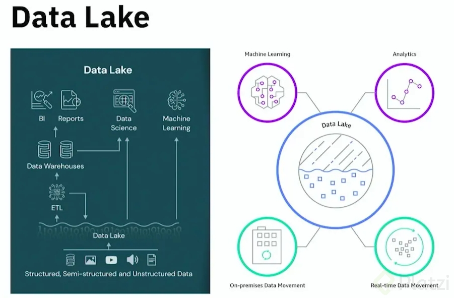 - Data Lake: Esquemas flexibles que se adaptan a los datos en bruto.