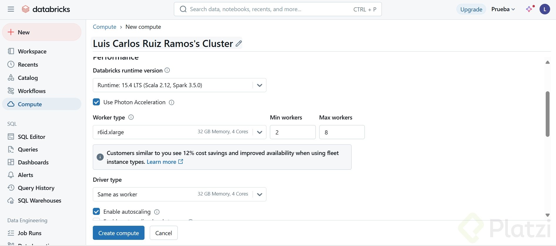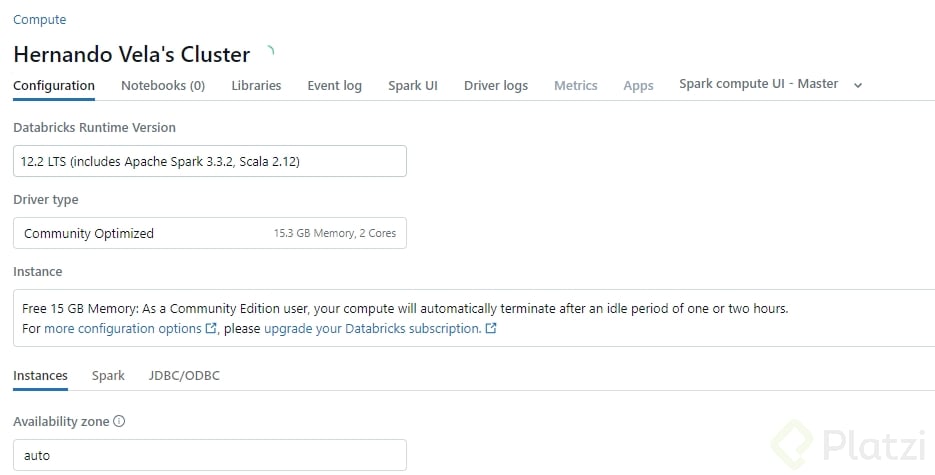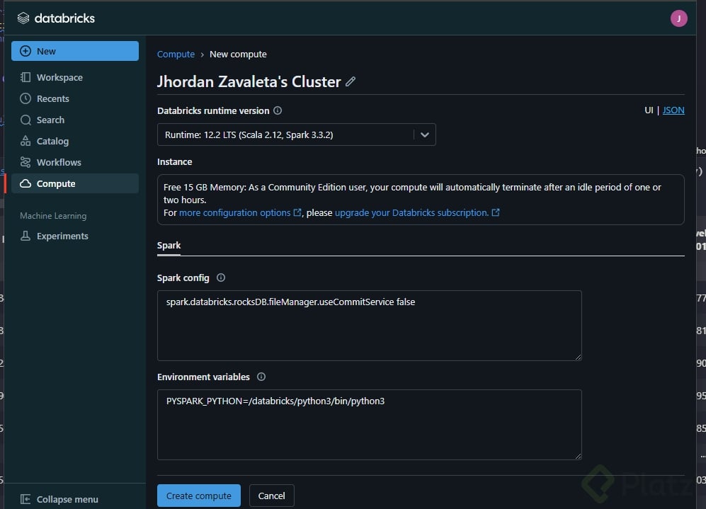 - Configurar las capacidades en términos de RAM y CPU, especialmente considerando las limitaciones de la versión gratuita de Databricks, que ofrece un máximo de 15 GB de procesamiento.