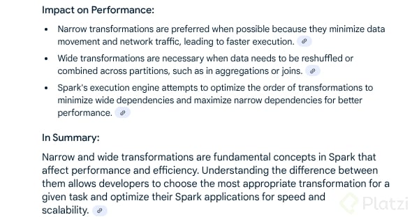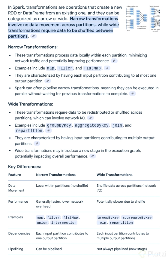 Ampliar conocimiento en Wide y Narrow Transformations: Estos conceptos son claves para entender cómo las transformaciones afectan el movimiento de datos y el uso de recursos en Spark.