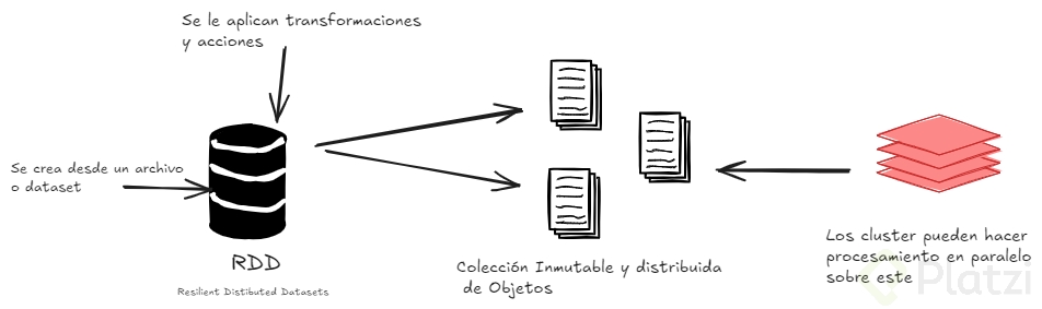 Distribución: Los RDDs se ejecutan en paralelo a través de los distintos nodos del clúster. Esto asegura una alta velocidad de procesamiento y eficiencia al trabajar con grandes cantidades de datos.