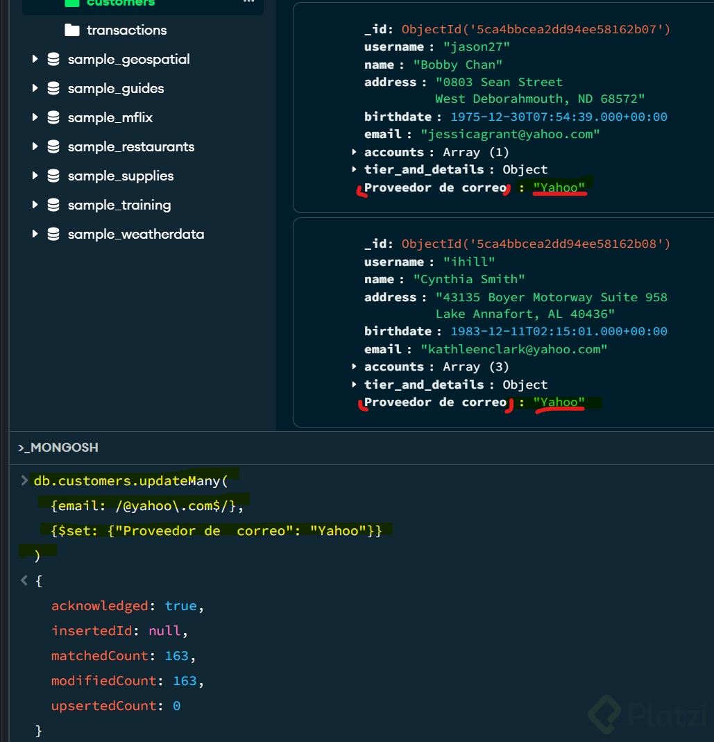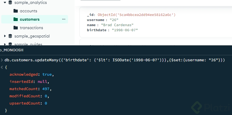 updateOnese usa para modificar ciertos campos del documento.updateManyse usa para modificar múltiples documentos que cumplen con un filtro.replaceOnereemplaza el documento completo.findAndModifyrealiza dos operaciones: actualización y retorno del documento modificado.