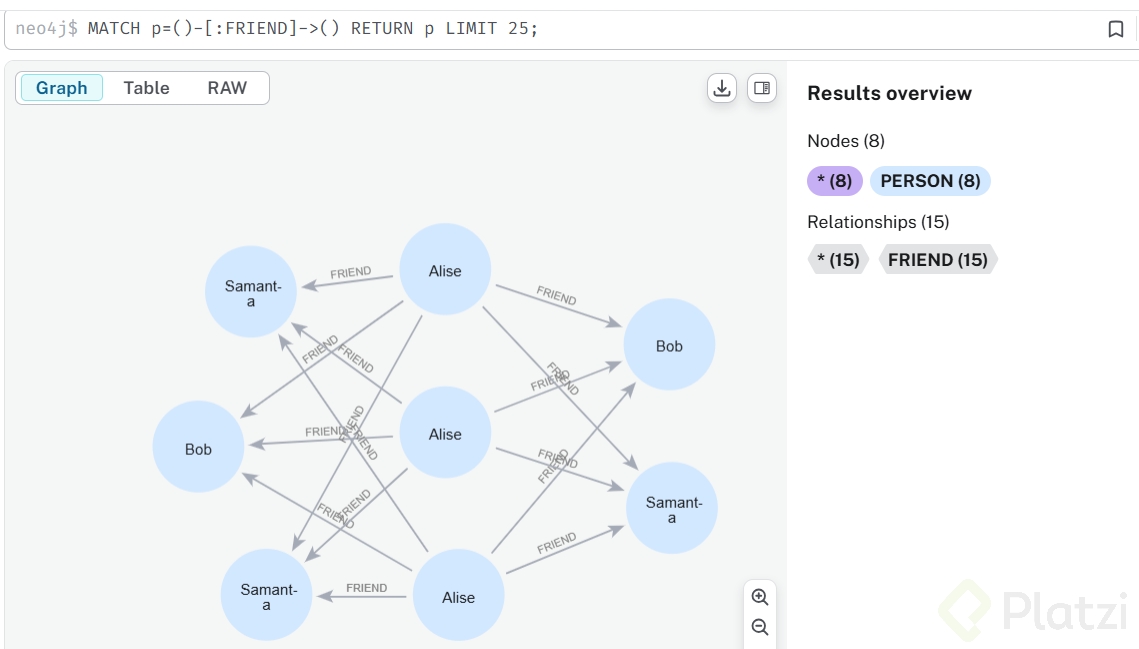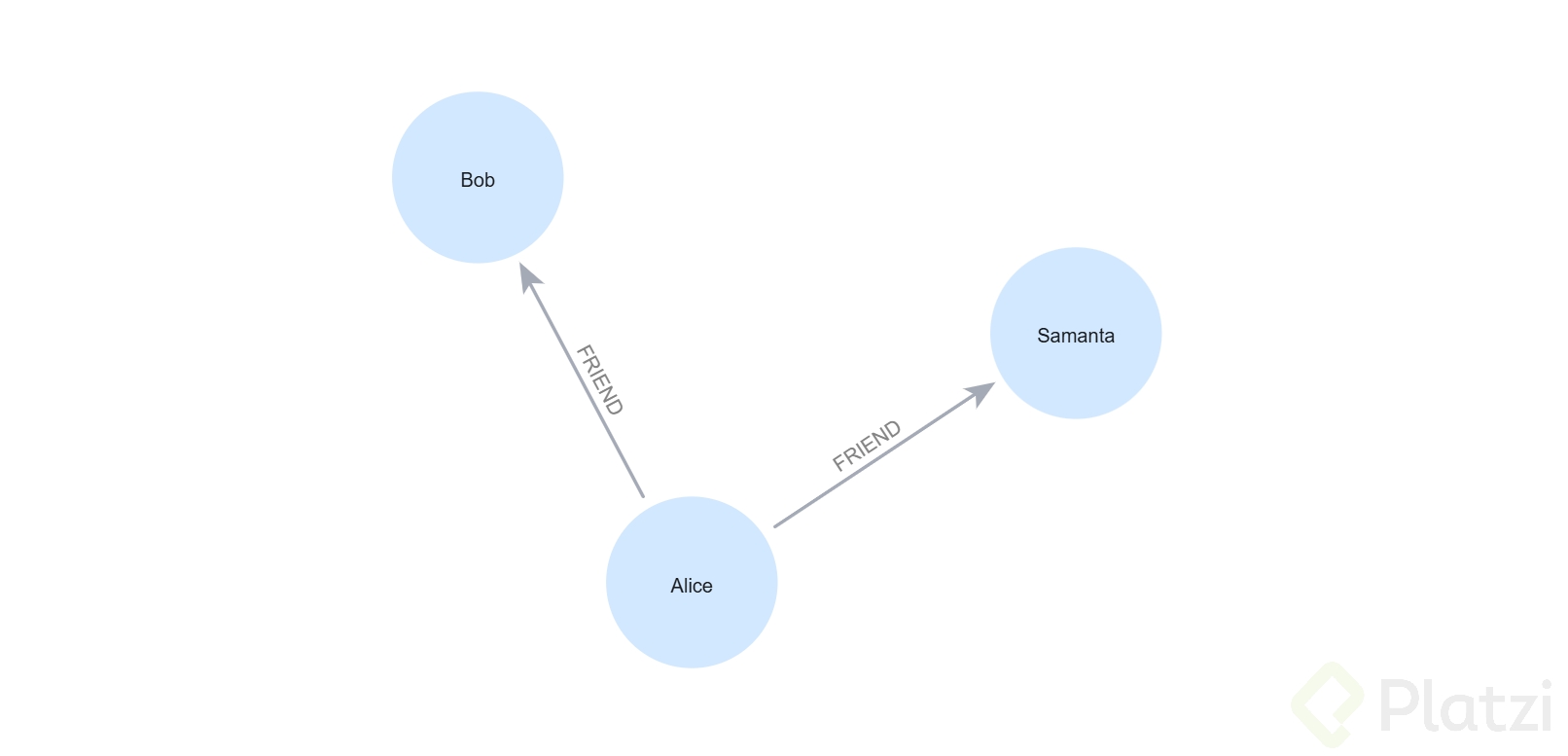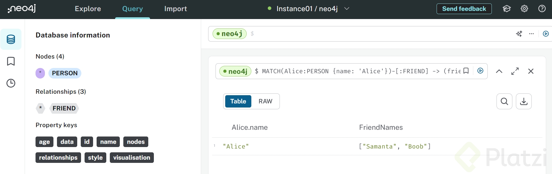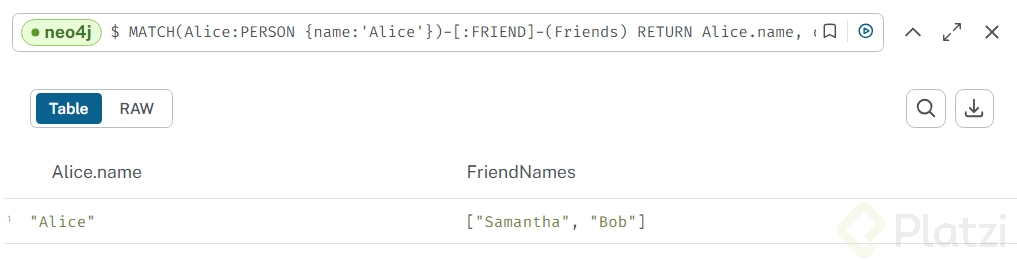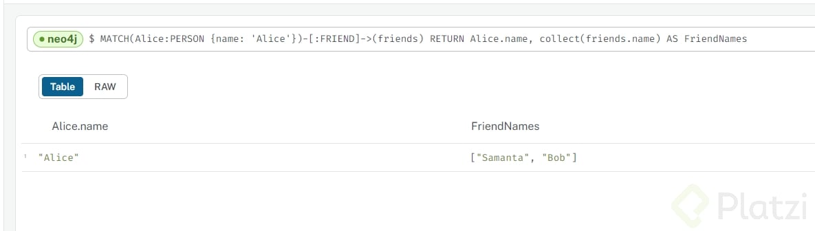 Esta consulta devuelve el nombre de Alice y una lista de los nombres de sus amigos.