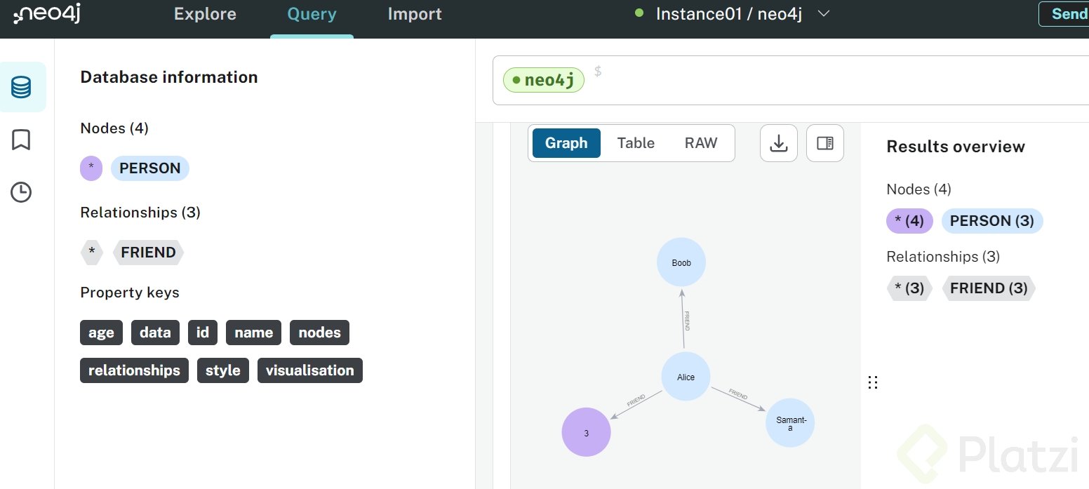 Con tu instancia creada, haz clic en “Open” e ingresa las credenciales descargadas. Este será tu entorno de trabajo. Para empezar a crear nodos, usa la palabra reservada create seguida de paréntesis que contienen el identificador y el tipo de entidad del nodo.