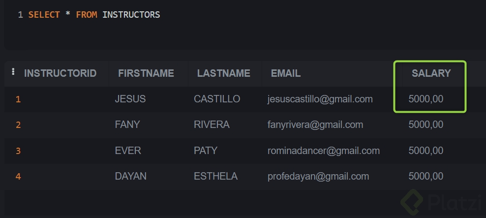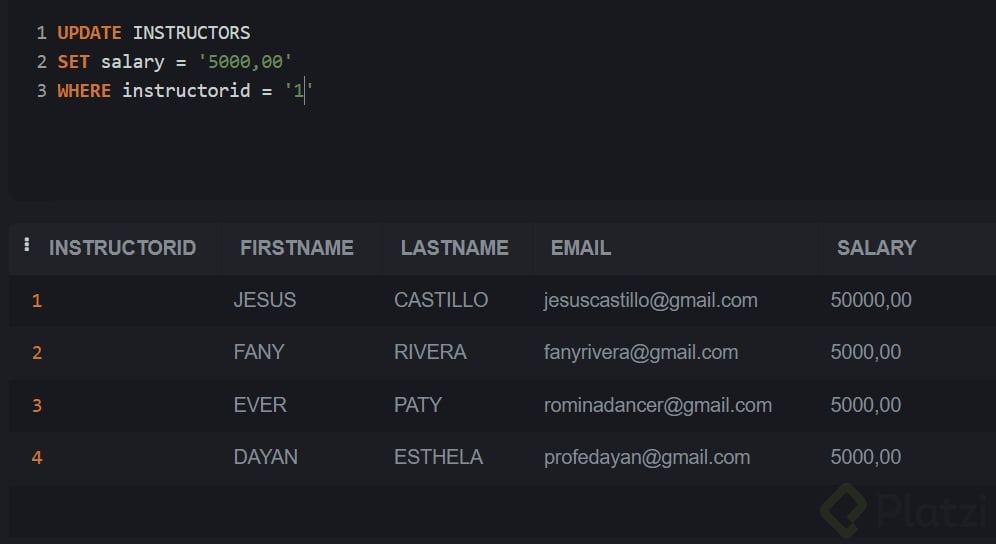 Si el ingeniero de datos necesita corregir el salario de Julián a 5000 dólares, la sentencia sería:
