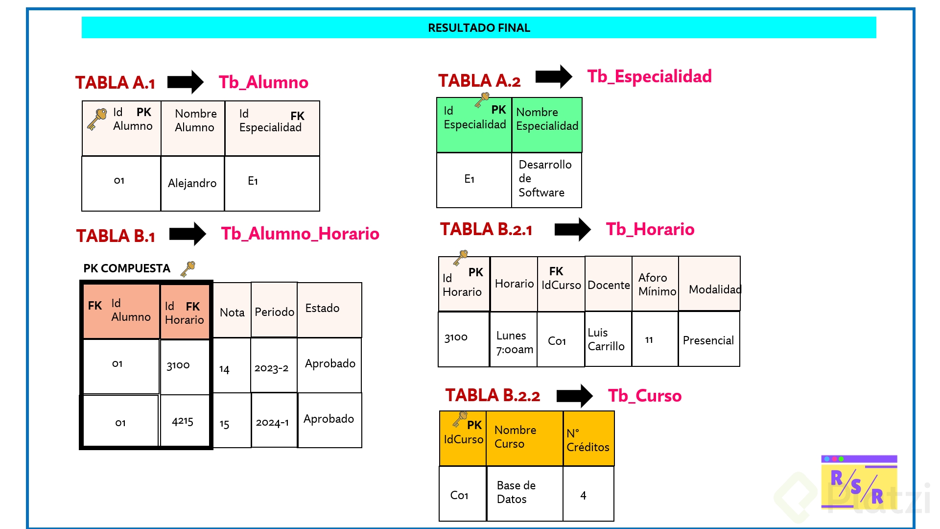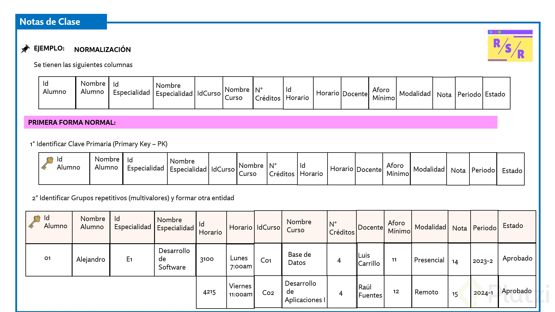 Un mal ejemplo sería tener un estudiante, Marco, con cursos listados en una sola columna. La solución correcta es crear un registro individual por curso y estudiante, asegurando que cada curso esté debidamente referenciado.