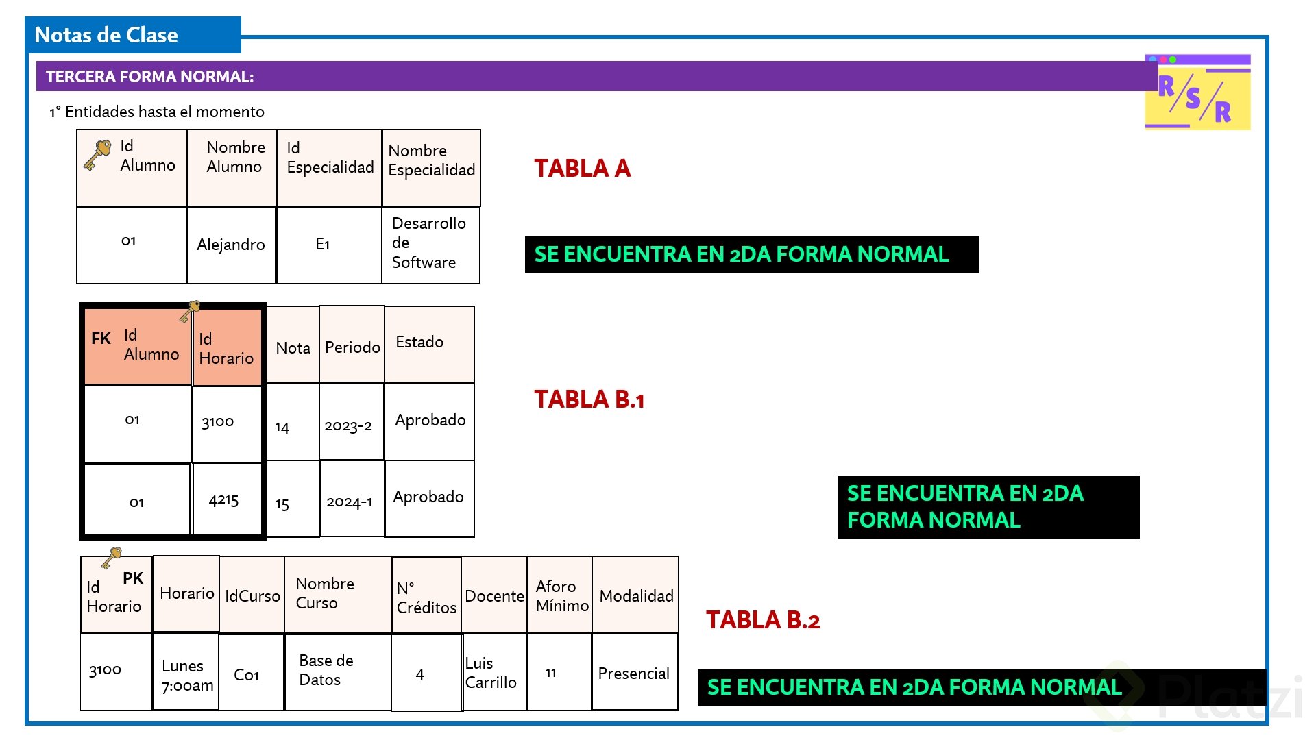 La tercera forma normal (3NF) añade que todos los atributos no clave deben ser independientes entre sí y cumplir con las dos formas anteriores. Se debe eliminar cualquier redundancia y dependencia innecesaria. En este caso, una tabla intermedia entre estudiantes y cursos puede ayudar a mantener la independencia de los atributos, relacionando estudiantes y cursos mediante identificadores únicos.