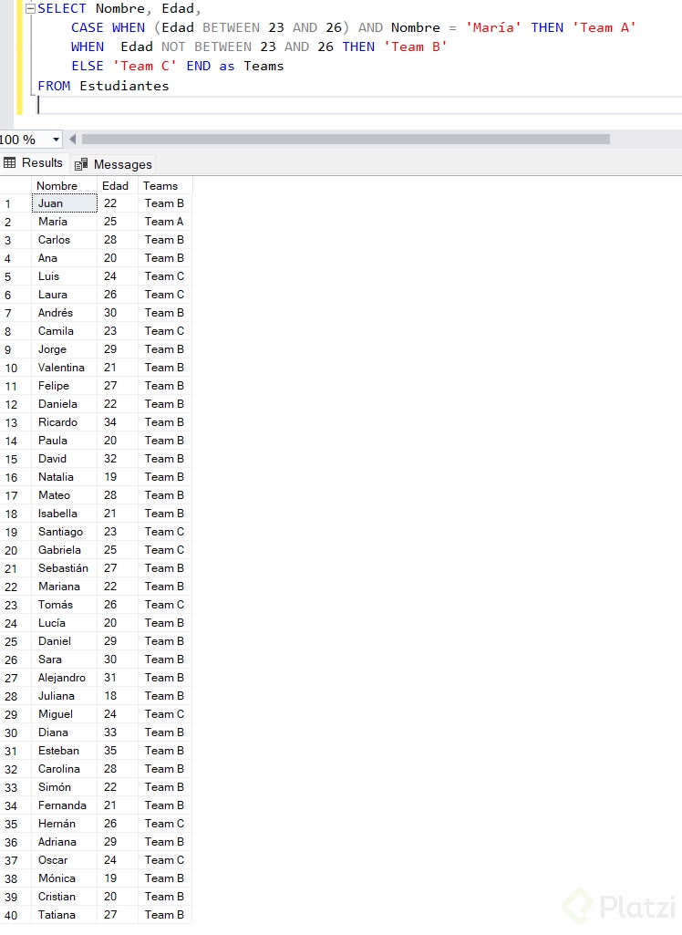 Este código te permite clasificar automáticamente a los estudiantes en Team A si se encuentran dentro del rango de 18 a 20 años y en Team B si no cumplen esta condición.