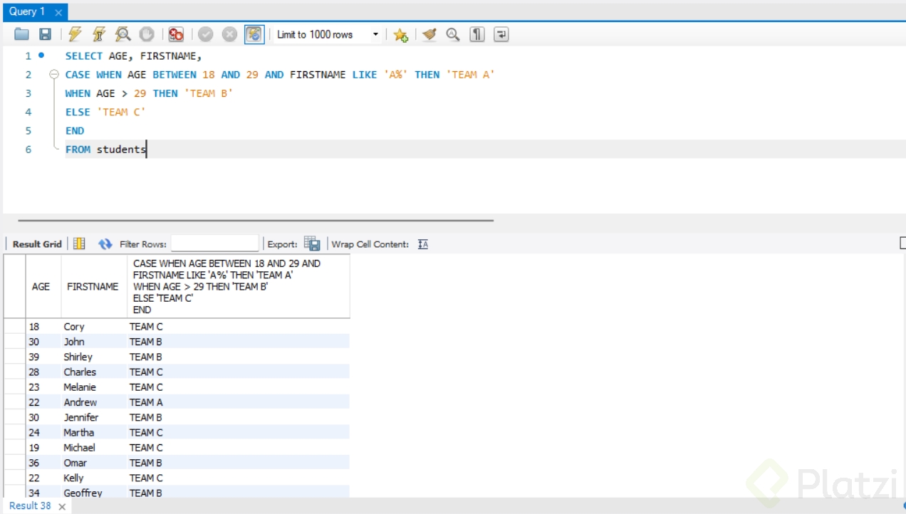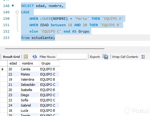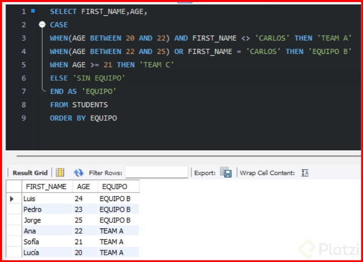 El uso del CASE WHEN es crucial cuando requieres clasificar datos según reglas específicas. Al evaluar un atributo como la edad de diferentes estudiantes y clasificarlos en equipos según su rango, el siguiente código SQL es útil: