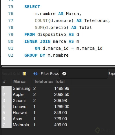 Right Joiny elLeft Join.SELECT p.*, m.nombre FROM productos p FULL OUTER JOIN marcas m ON p.marca = m.id;