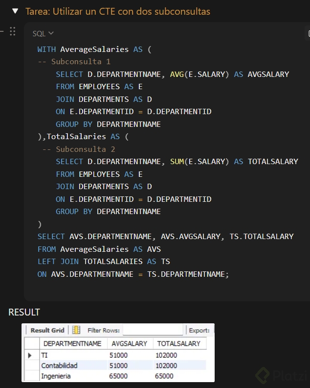 Las CTE pueden contener una o varias subconsultas. En el caso de múltiples subconsultas, pueden relacionarse entre sí mediante JOIN, INNER JOIN, LEFT JOIN, RIGHT JOIN y otras herramientas que hemos aprendido en SQL.