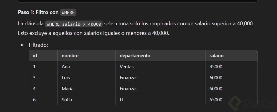 BETWEENpara buscar un rango de valores:SELECT * FROM empleados WHERE salario BETWEEN 40000 AND 60000;