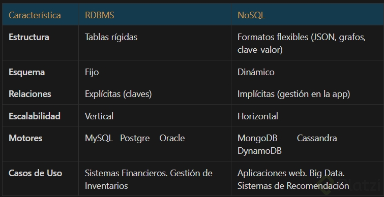 Por otro lado, las bases de datos no relacionales, también conocidas como NoSQL, presentan una estructura mucho más flexible. En estas bases, la información se puede almacenar en diversos formatos, como grafos, archivos JSON, o sistemas de clave-valor, y se pueden agregar atributos nuevos sin modificar su estructura subyacente. Además, las relaciones no son explícitas como en las relacionales, lo que conlleva a una gestión diferente del manejo de conexiones y reglas a nivel de aplicación.