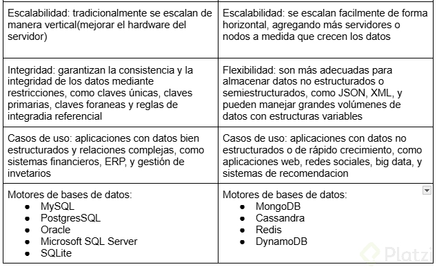 En contraste, las bases de datos no relacionales son adecuadas para el almacenamiento de datos no estructurados o semi-estructurados, como los que generan las aplicaciones web, redes sociales y algunos proyectos de Big Data. Estas bases sobresalen en el manejo de datos vectoriales y otros formatos que requieren flexibilidad. Algunos motores de bases de datos no relacionales populares son MongoDB, Cassandra, Redis y DynamoDB.