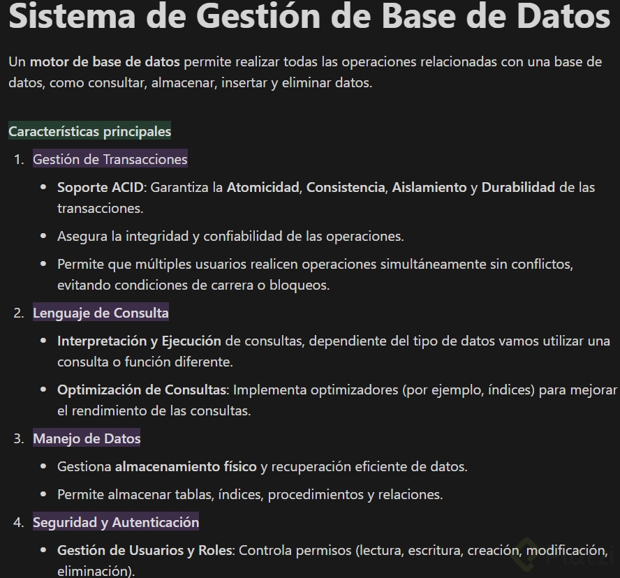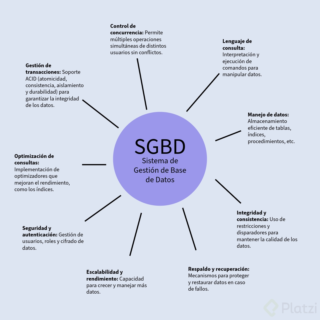 Un sistema de gestión de bases de datos (SGBD) es una herramienta indispensable para manejar cualquier operación relacionada con bases de datos, como consultar, modificar y almacenar información. Además, facilita la recuperación de objetos dentro de la base de datos. Entre sus funciones principales, se encuentra el manejo de transacciones seguras y confiables, gracias al soporte ACID (atomicidad, consistencia, aislamiento y durabilidad), que garantiza la integridad de las operaciones realizadas.
